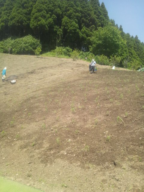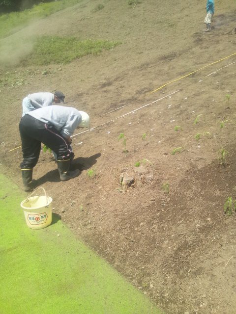 コスモス苗植え 2014.5.31 昨日、今日と夏の様な暑さですね。暑さが苦手な私は・・・。そんな中、展望公園では、農事部がコスモスの苗植えをしています。 広い斜面に等間隔になる様に、ひとつひとつ手作業でしています。 暑い夏が過ぎ、見頃の秋が楽しみです♪