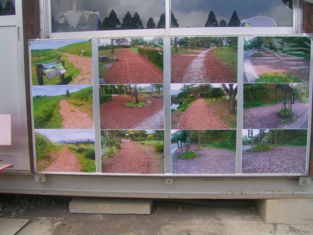 日和技建の事務所の前にチップの使用事例を展示しています。