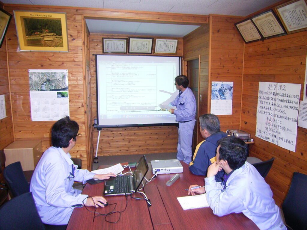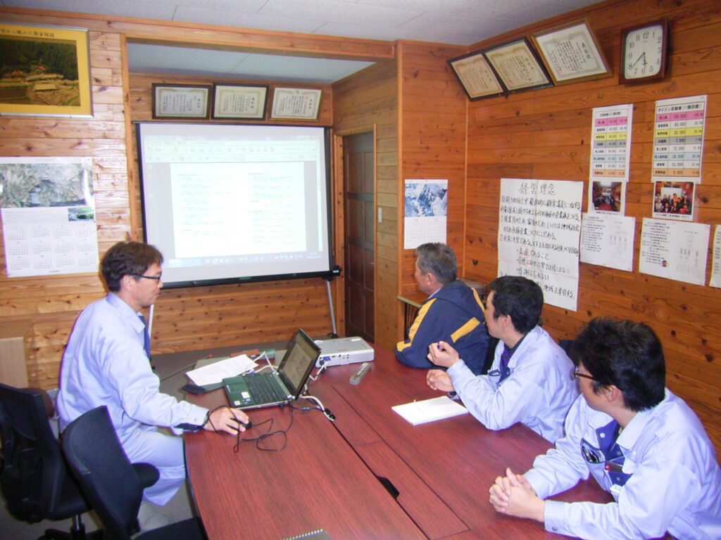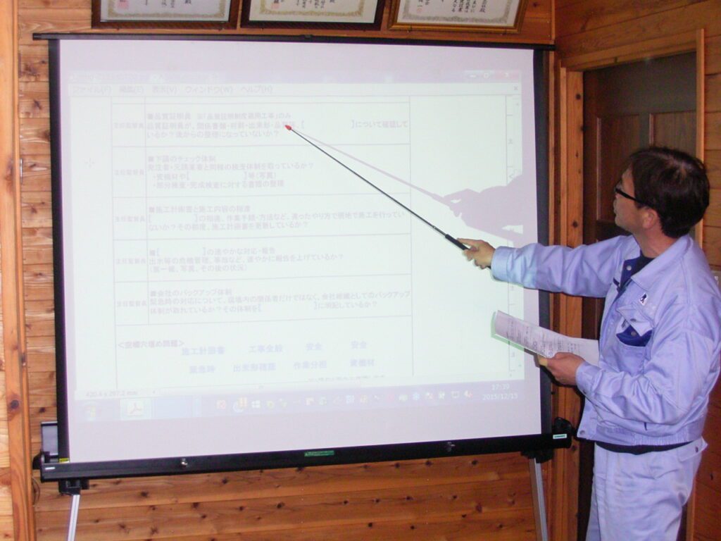 大仁産業 工事部 12月度勉強会 2015.12.21 平成27年度12月の勉強会を本田が担当し行いました。というのも、去る9月29日にグランメッセにて受講した『工事成績対策講習会』の内容を部員で共有すると共に、工事部全体でこれからの工事成績アップに向け着手から施工、完工までの中で常に頭に置き施工を進めてこうというものにするために行いました。