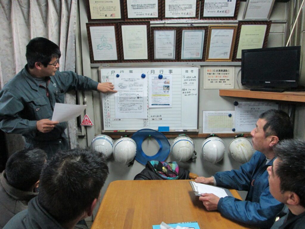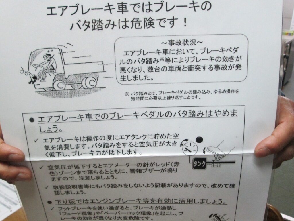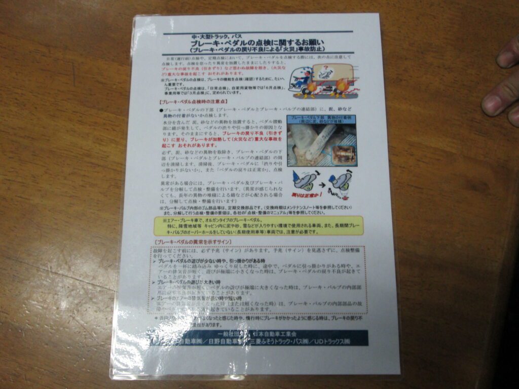 日和技建1月度勉強会 2015.1.26 2015年平成27年になりあっという間に1月も終わりそうですね・・・。雨や雪時には冷たい北風と戦い!?ながら日和技建のメンバーも毎日笑顔で頑張っています!!1月勉強会は鎗水正幸さんの担当で「ブレーキペダルの点検と注意点」について勉強・意見交換・共有しました。 資料も準備して、分かりやすい勉強会だったと思います。 安全第一・無事故・無違反で業務遂行をお願いします!!