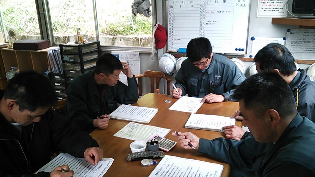 そんな寒い中、頭をひねりひねり日和技建のメンバーが、子供の頃に戻ったように、ミニテストを受けました。