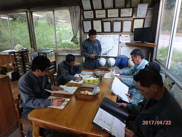 日和技建4月度勉強会 2017.4.24 今年も4月が終わりに近づき、ゴールデンウィークがやってきますね。交通量も増えるし、県外ナンバーも多くなり注意が必要です。今月の勉強会は「重機運搬」について場長代理の河津さんが行いました。危険と事故が伴う重機運搬です。安全と価格の見直しをしました。 これからも安全第一・無事故・無違反で頑張ります!!
