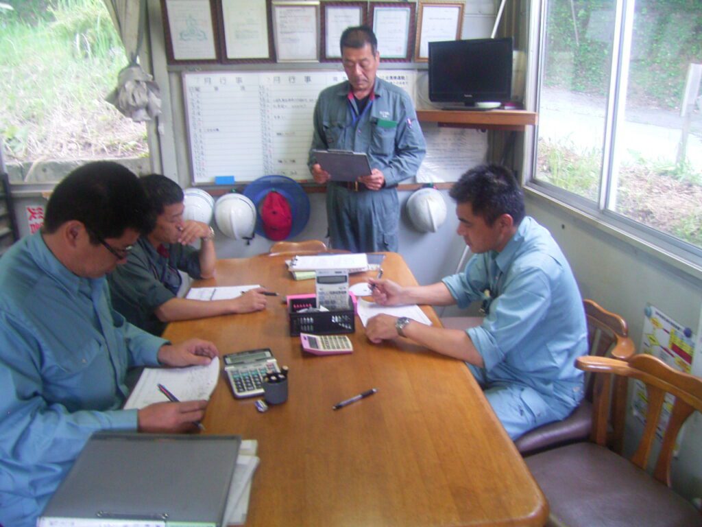 日和技建7月度勉強会 2014.7.31 暑中お見舞い申し上げます! 今月は木村さんにより、「処理場内の車両の点検」について勉強会しました。最近は脱輪による事故はないが点検ハンマーを使っての始業前点検など再確認しました。暑い夏・・・。タイヤの減りも早く、燃費も悪くなるので、積み込み中はエンジンを切るなどして、経費削減にみんなで努めています。皆さんも熱中症など体調に気を付けてお仕事頑張ってください!!
