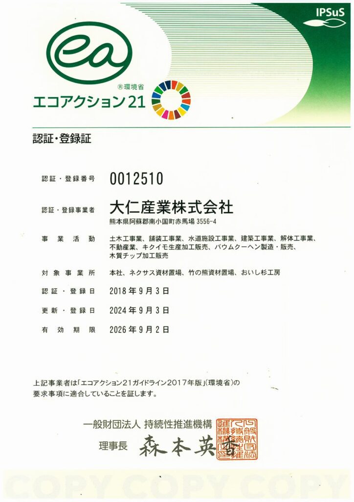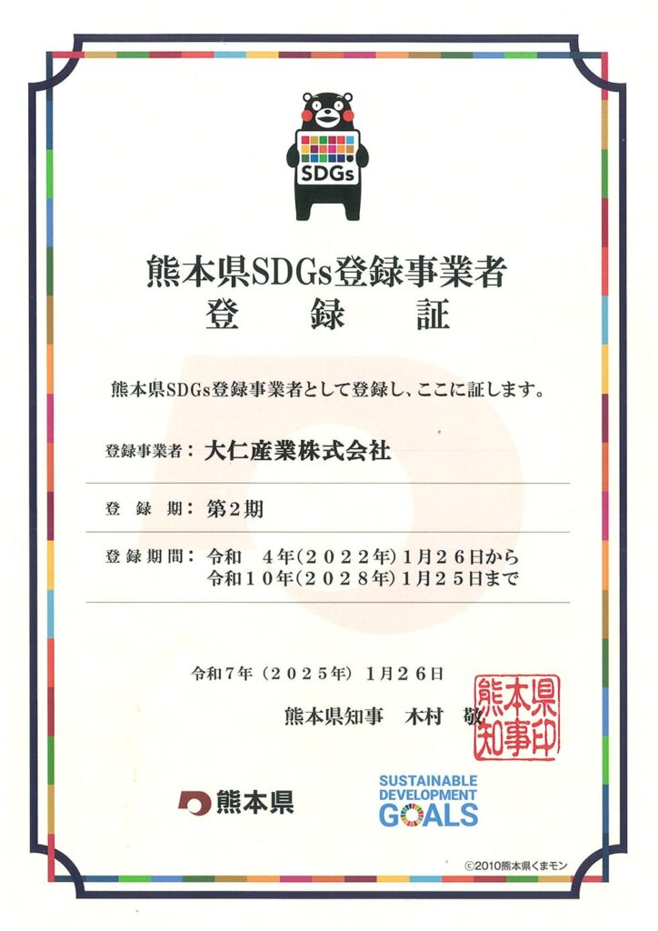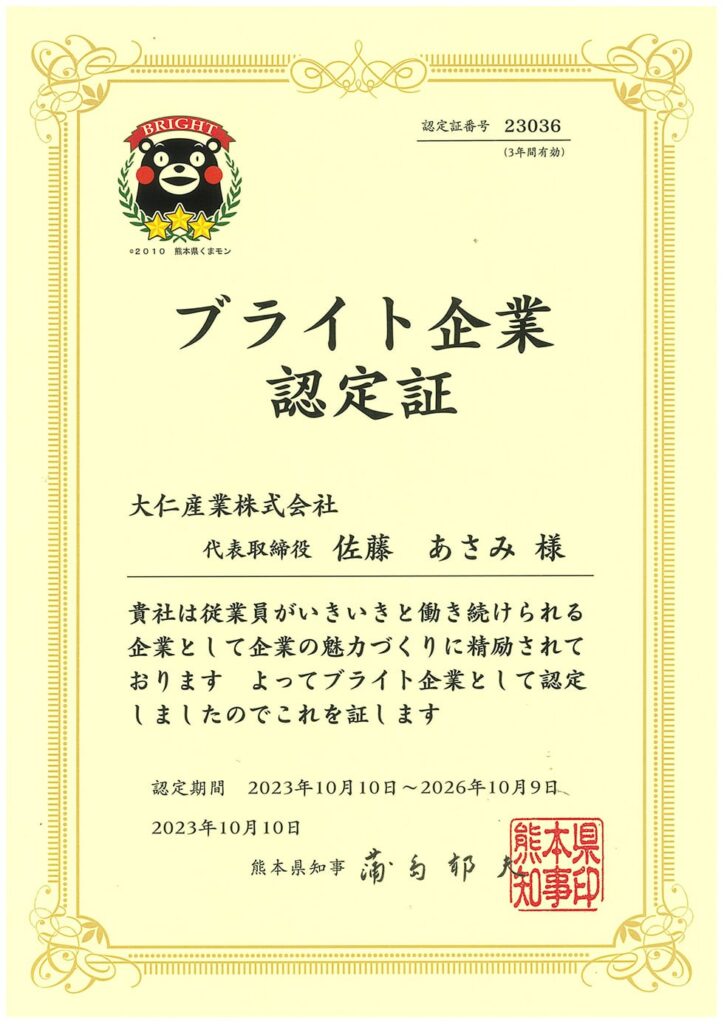 ごあいさつ 大仁産業株式会社は、快適な生活環境を提供するため阿蘇地域を中心に数十年と、道路・公園・河川・橋などを中心に公共土木工事を手がけてまいりました。 また、協力会社である株式会社日和技建では、ISO取得、産業廃棄物処理も手がけており、株式会社ダイジン自動車では、自動車車検等の対応もしております。 その基盤を活かし、お客様の快適な「住まい」の提供に努めております。 些細なご質問でも構いません。お気軽にお問合わせ下さい。 お知らせ 日常の様子 2025.9.242025.9.24 | くじゅう・わいた展望公園 てんぼーマルシェ開催のお知らせ‼️ 2025.9.102025.9.10 | くじゅう・わいた展望公園 8月17日水遊びてんぼーマルシェ追加出店者さんのお知らせ🫶 2025.8.132025.8.13 | くじゅう・わいた展望公園 水遊びてんぼーマルシェ開催👏 2025.8.82025.8.8 | くじゅう・わいた展望公園 大仁グループお知らせ一覧 経営理念 Management Philosophy 技術力の向上が、最終的に顧客満足につながる。利益を追求し続けられる、高付加価値の企業体をつくる。 1 従業員のため、家族のため、しいては地域社会のため永続企業創りにこだわる。 2 社員こそ宝である。以下を大切にする社員つくりを目指す。 ・素直であること・目標に向かって努力を惜しまない・感謝を忘れない 3 強いリーダーシップを発揮し、地域を牽引する。何事にも挑戦し続ける。 品質方針 Quality Policy 顧客の求める施工物を当社の技術をもって提供し、常に改善を行い顧客満足の向上に努め信頼を得る。 会社概要 Company 商号 大仁産業株式会社 代表者 佐藤 あさみ 所在地 〒869-2401 熊本県阿蘇郡南小国町赤馬場3556-4 TEL 0967-42-0463 FAX 0967-42-0735 事業エリア 阿蘇郡を中心に、熊本県、大分県全域対応いたします。地域に関してはご連絡ください。 資本金 5,000万円 営業時間 9:00~17:00 関連会社 ・株式会社 日和技建 ・株式会社 ダイジン自動車 ・有限会社 山中産業 資格取得者一覧 ・1級土木施工管理技士 10名 ・1級土木施工管理技士補 1名 ・2級土木施工管理技士 11名 ・1級舗装施工管理技術者 4名 ・測量士 2名 ・測量士補 1名 ・1級建設機械施工技士 2名 ・2級建設機械施工技士 6名 ・2級管工事施工管理技士 5名 ・解体工事施工技士 5名 ・浄化槽設備士 4名 ・宅地建物取引主任者 3名 ・2級建築士 1名 ・1級建築施工管理技士 1名 ・2級建築施工管理技士 4名 ・1級建設業経理士 1名 ・2級建設業経理士 2名 ※2025年6月現在 沿革 History 1966年4月 創業 創業者:俵 明 屋号:大仁産業 1980年1月 組織変更 屋号:大仁産業 有限会社 1989年6月 組織変更 屋号:大仁産業 株式会社 社長:俵 一幸 1993年9月 関連会社 屋号:(株)日和技建 設立 1996年11月 整備部門、大仁自動車 認証取得 2003年4月 ISO9001認証取得・日和ISO14001 2005年9月 整備部門、大仁自動車→会社分割 屋号:(株)ダイジン自動車 2007年4月 人材教育(NBC)導入 2009年11月 くじゅうわいた展望公園開設 2011年10月 ココロホーム新設 持続可能な開発目標 SDGs 認証 Authentication 南小国の青空とともに ~DaijinSangyou History~