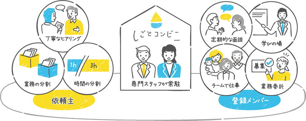 仕事を実施するのは、面談を経て登録メンバーとなった住民さん。依頼主は、事業所や住民さん、行政など。スタッフは、丁寧にヒアリングした両者の希望を実現できるように、仕事を時間×業務内容で分解したり、チーム制で責任の分散をするなどの工夫をして、仕事の発掘を行い両者を繋ぎます。